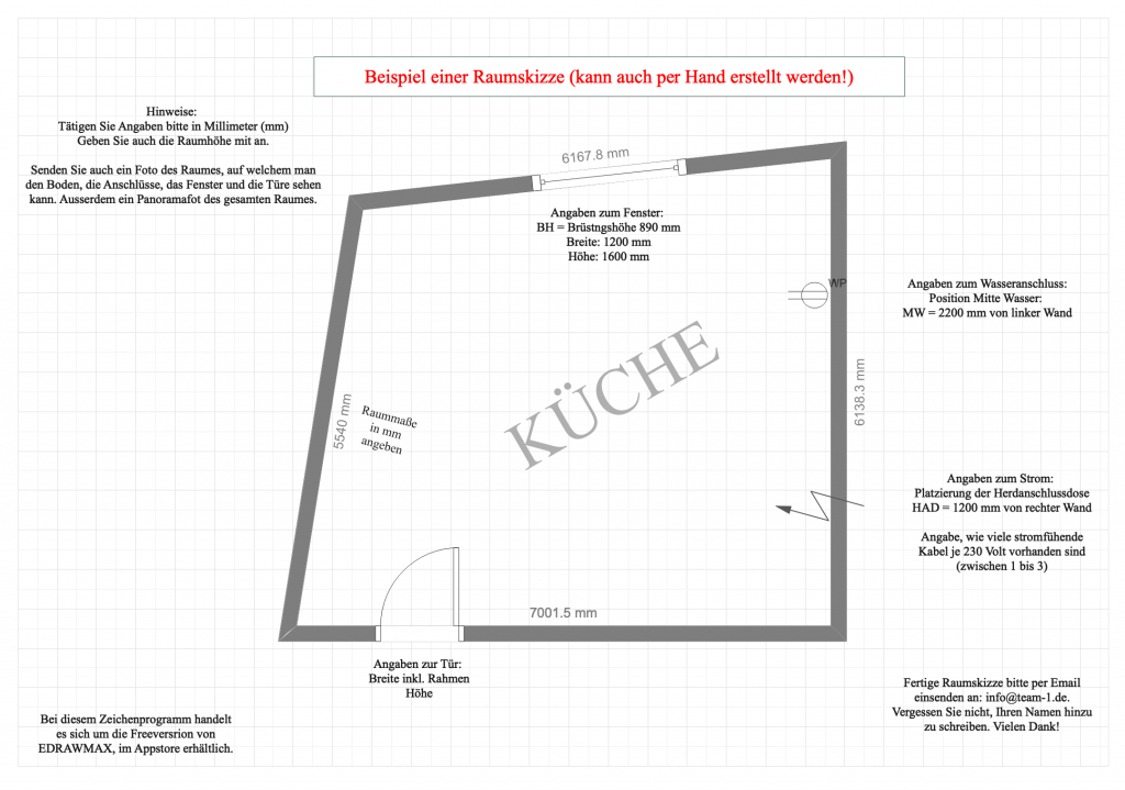 - Breite, Länge und Höhe des Küchenraumes