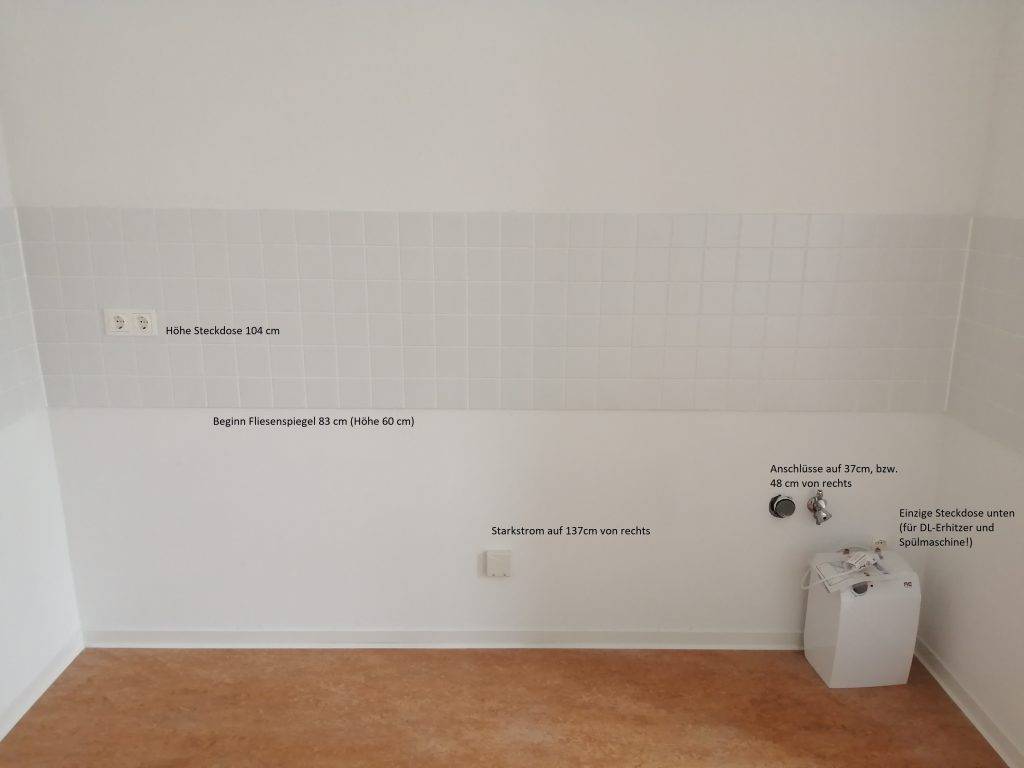 - Position der Steckdosen an den Wänden, an denen die Küche später gestellt werden soll