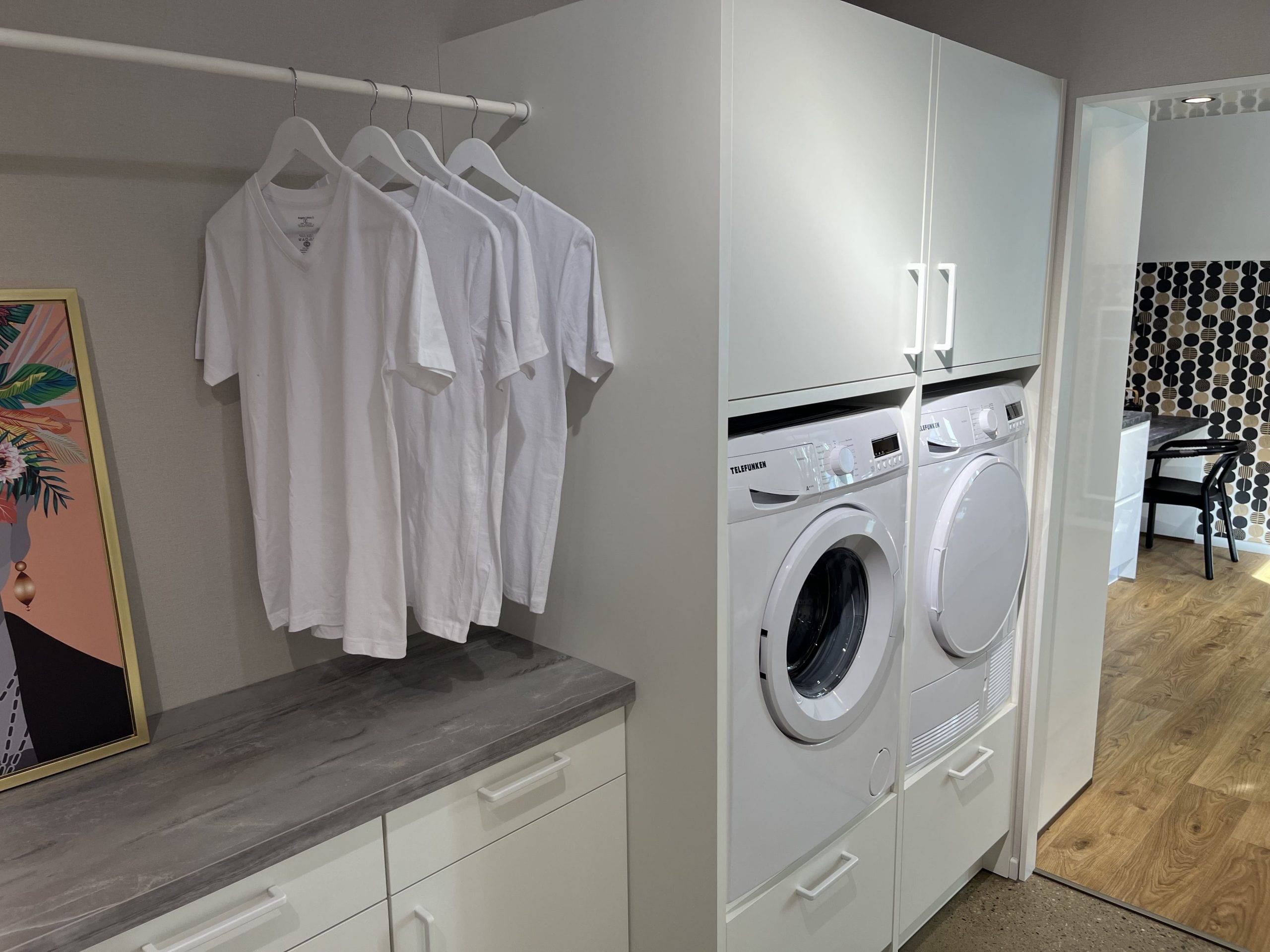 Hier lassen sich Geräteschränke aller Art von Anfang an einplanen, nicht nur für Waschmaschinen oder Trockner, sondern z.B. auch für erhöhte Geschirsspüler u.s.w.